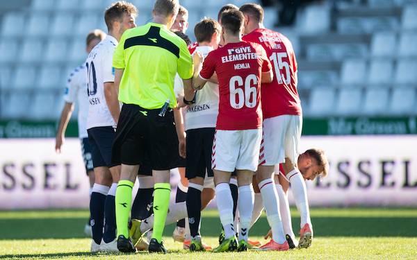 AGFs spillere var rasende over dette brud på de uskrevne regler. Jens Stage forløb sig ved at skubbe til Finnbogason, så han – noget overraskende for en voksen islænding – satte sig på halen. Det ville mange vejlensere gerne have takseret til rødt, men dommer Peter Munch Larsen holdt hovedet koldt og gav gult til begge stridshaner. Tumulten fortsatte på sidelinjen, men til Vejles store ros vandt besindigheden, så AGF efterfølgende helt uhindret kunne udligne til 1-1, da Patrick Mortensen kunne spadsere bolden i mål. Det var fair play, som vi er mange der fra gammel tid også altid har forbundet med Vejle. Spillets gentlemen med spillere som Erik Skaaning, Tommy Troelsen, Ulrik le Fevre, Johnny Hansen, Allan Simonsen, John Sivebæk og Steen Thychosen.