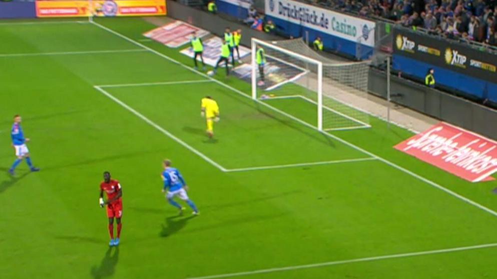 Kiels midtbanespiller Michael Eberwein var i færd med at varme op bag sit holds baglinje. En Bochum spiller afslutter, men bolden passerer et godt stykke forbi mål, og Eberwein stikker foden frem og standser bolden på vej ud over stregen. Dommer Timo Gerach fløjter for målspark. Men VAR-dommeren vil det anderledes. Det viser sig, at bolden ikke helt har forladt stregen, så teknisk set er en udskiftningsspiller ulovligt trådt ind på banen og deltaget i spillet. Efter at have konfereret med VAR-dommeren dømmer kampens dommer straffe til Bochum. Bochums Silvere M’Boussy tager straffesparket og tordner det i mål til udligning 1-1.