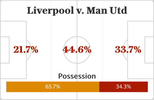Første halvleg tilhører Liverpool, der helt dominerer midtbanen, hvor ellers så stærke Fernandes er helt sat ud af spillet, mens Thiago svinger taktstokken for hjemmeholdet. Manchester United har kun bolden halvt så meget som Liverpool.