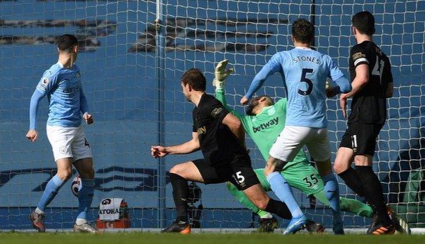 Desværre for West Ham blev keeper Fabianski skadet under træningen dagen før kampen, så Randolph måtte på mål. Han havde forbavsende lidt at se til, men han svigtede i et afgørende øjeblik, da han i 29. minut blev stående på stregen ved De Bruynes lange, høje indlæg midt for mål, som Dias headede i mål til 1-0. Den burde målmanden have angrebet og plukket ned.